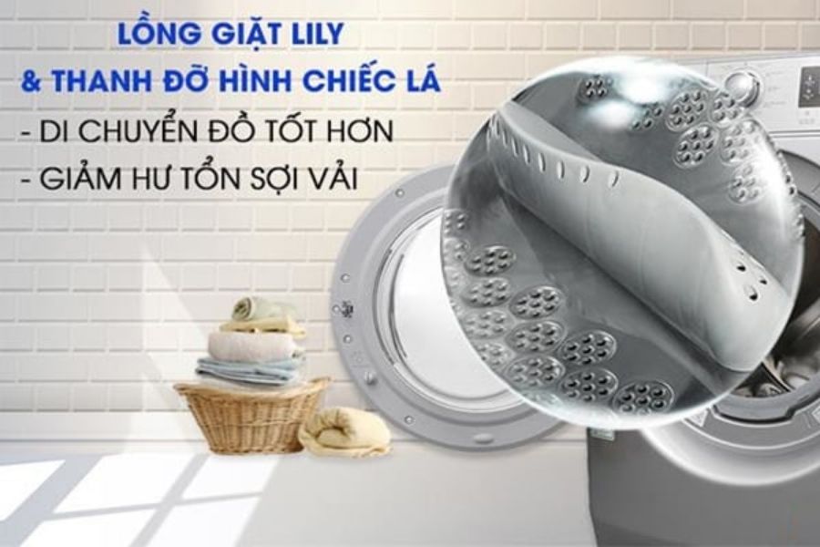 Công nghệ thanh nâng và thùng giặt Lily được thiết kế đặc biệt được tối ưu hóa để hỗ trợ công nghệ giặt. Với thanh nâng hình chiếc lá và lồng giặt Lily được thiết kế đục lỗ đặc biệt, giúp quần áo thẩm thấu nước nhanh, tăng hiệu quả giặt sạch và giảm hư tổn cho quần áo.