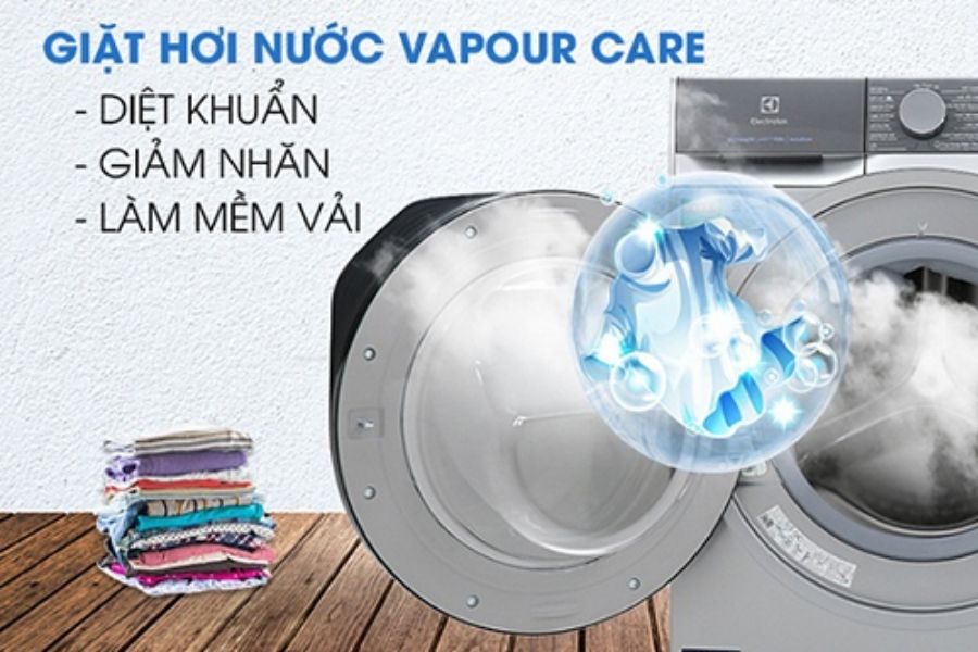 Công nghệ giặt hơi nước Vapour Care của máy giặt Electrolux sử dụng nhiệt độ hơi nước lên đến 70 độ C để loại bỏ 99% vi khuẩn và nấm mốc. Đồng thời giảm nhăn quần áo 22%, tiết kiệm thời gian là ủi.