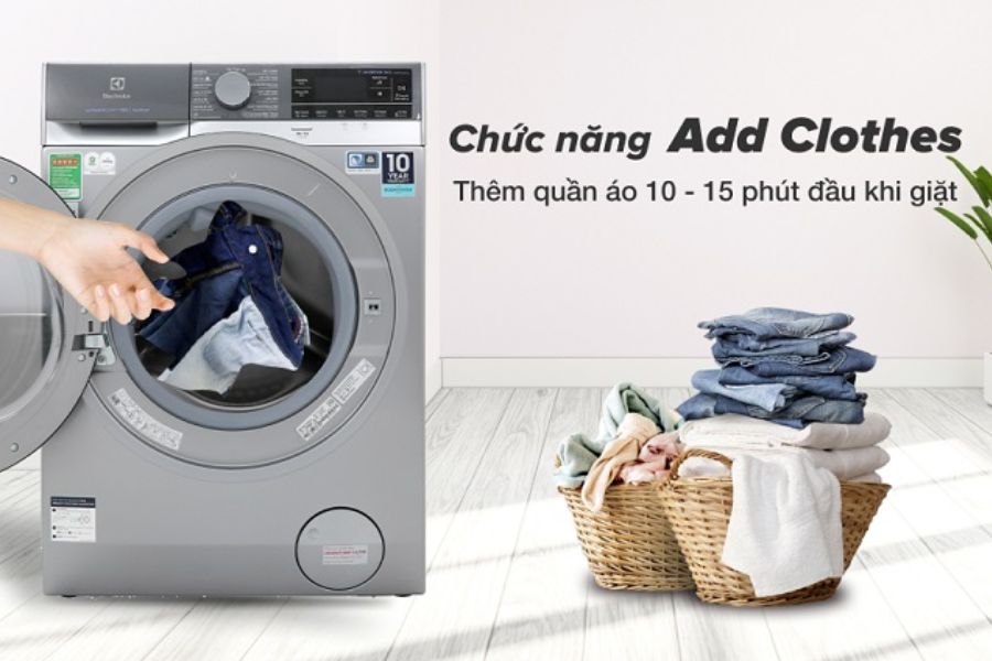 Nếu vô tình sót quần áo trong quá trình giặt, máy giặt Electrolux có tính năng Add Clothes giúp bạn bổ sung thêm trong khoảng 10 – 15 phút đầu tiên của chu trình giặt hoặc khi đèn Add Clothes còn sáng. Điều này giúp cho người dùng cảm thấy tiện lợi và linh hoạt.
