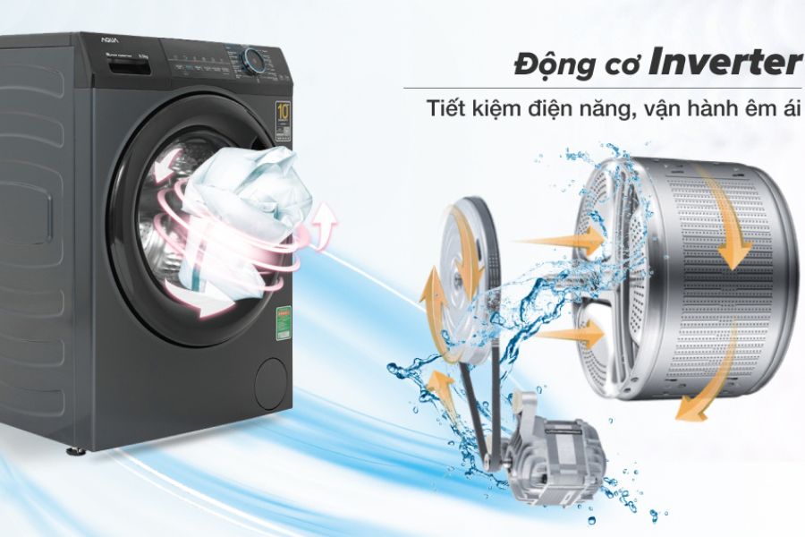 Trong cấu tạo của máy giặt Inverter, motor dẫn động được gắn trực tiếp vào mâm giặt. Vì thế, thiết bị điều chỉnh công suất và tốc độ quay của động cơ một cách linh hoạt, giúp tiết kiệm năng lượng và không gây ra tiếng ồn khó chịu.