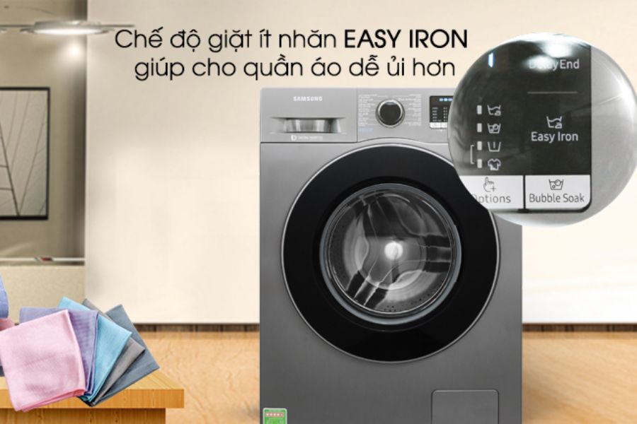 Chương trình Easy Iron sẽ giảm tốc độ quay của lồng giặt, hạ thời gian sấy xuống mức tối đa, giúp giảm thiểu việc quần áo bị xoắn và hạn chế việc tạo nếp nhăn trên vải. Chương trình giặt ít nhăn Easy Iron này giúp người dùng dễ dàng và nhanh chóng hơn trong việc là ủi quần áo.