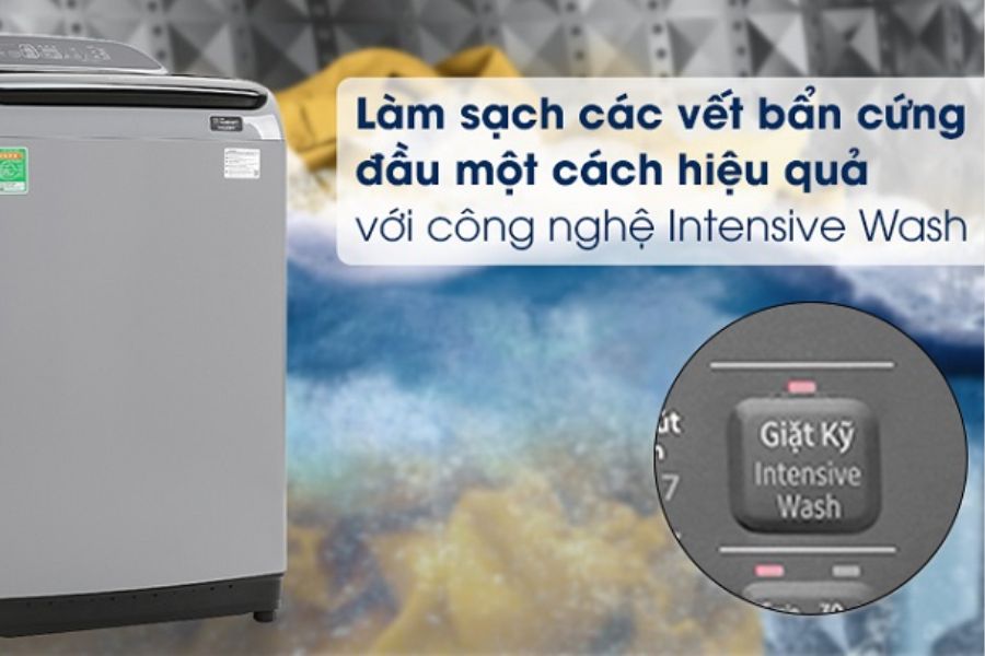 Chế độ Intensive Wash có thể được áp dụng trong mọi chương trình giặt của máy giặt Samsung. (Có sẵn trong tất cả các chương trình, trừ Quick Cycle và Delicate Cycle). Chế độ này giúp nhanh chóng hòa tan bột giặt và thẩm thấu sâu vào vải, loại bỏ hiệu quả các vết bẩn cứng đầu như trà, rượu hoặc mỹ phẩm.