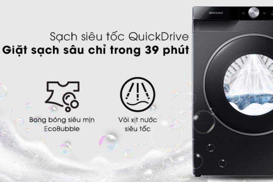 Công nghệ Quick Drive là tính năng giặt nhanh siêu tốc được tích hợp trên các dòng máy giặt lồng ngang của Samsung. Tính năng này cho phép việc giặt giũ quần áo chỉ trong 39 phút. Với công nghệ này, quần áo được giặt nhanh gọn nhưng vẫn đảm bảo hiệu quả giặt sạch, giúp tiết kiệm thời gian chăm sóc gia đình.