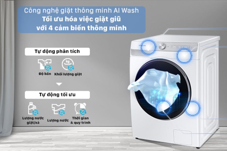AI Wash là công nghệ của máy giặt Samsung được áp dụng cho các dòng máy sản xuất từ năm 2021. Công nghệ này tích hợp 4 cảm biến cho phép máy giặt nhận diện chính xác khối lượng và mức độ bẩn của quần áo.