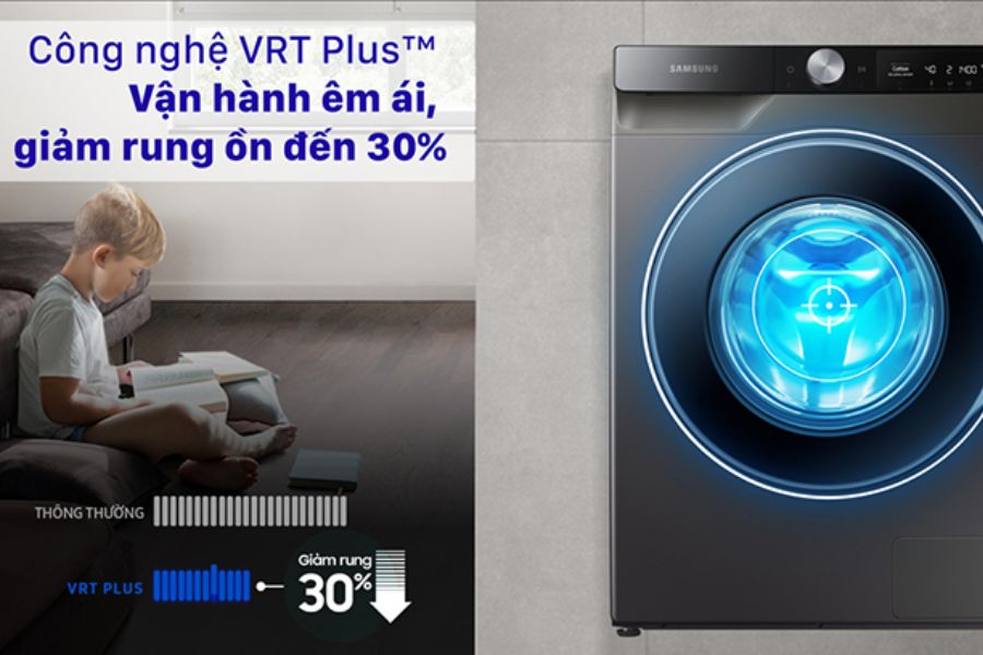 Quá trình giặt sẽ trở nên nhẹ nhàng và êm dịu hơn nhờ công nghệ VRT Plus™, giúp giảm đến 30% rung và tiếng ồn. Khung máy được thiết kế mới cung cấp sự ổn định cao hơn, kết hợp với bộ cảm biến nhận diện rung và tiếng ồn, giúp tối ưu hóa hiệu suất vận hành của động cơ máy giặt.