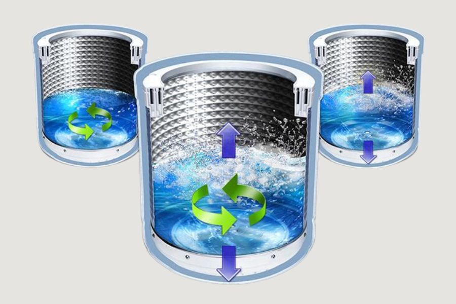 Nước được tạo ra từ các hướng khác nhau sẽ len lỏi vào bên trong quần áo, giúp loại bỏ vết bẩn hiệu quả, nhanh chóng. Đồng thời, công nghệ này giảm thiểu ma sát, từ đó hạn chế sự xoắn và nhăn nhúm của quần áo trong quá trình giặt.