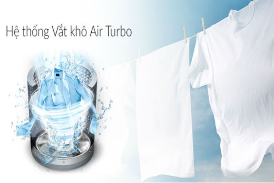 Hệ thống vắt khô Air Turbo được Samsung cải tiến và tích hợp trực tiếp trong lồng giặt. Công nghệ này giúp máy giặt thực hiện quá trình vắt cực khô để quần áo nhanh chóng mất nước, đồng thời sử dụng hai cửa hút khí để tạo lực hút nhanh chóng, giúp quần áo loại bỏ nước hiệu quả hơn.
