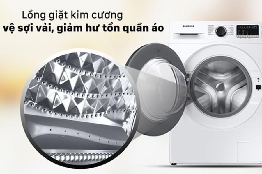 Lồng giặt kim cương được thiết kế với cấu trúc đặc biệt, hình dạng như viên kim cương nhỏ kết hợp với hệ thống lỗ thoát nước li ti. Thiết kế này không chỉ tăng cường hiệu suất giặt sạch mà còn giúp giảm tình trạng sợi vải bị mắc vào lồng giặt, hạn chế nguy cơ rách, dãn hoặc sờn của quần áo.
