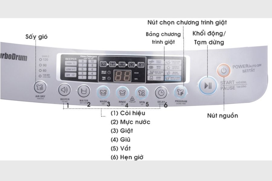 - Tiện ích: Hẹn giờ giặt, khóa trẻ em, thêm đồ khi giặt,…
