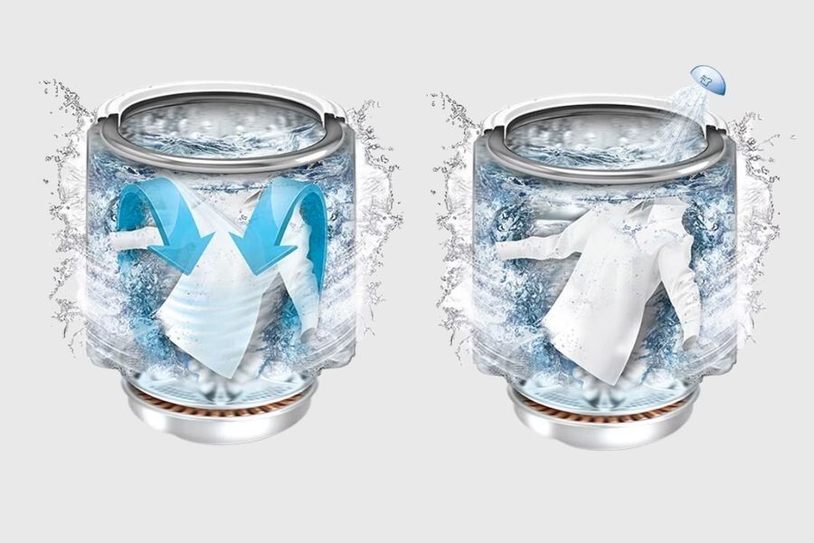Khi này, quần áo trong lồng sẽ được nhào lộn liên tục, giúp quần áo tránh bị kéo dãn, hư hỏng do xoắn chặt lại với nhau. Đồng thời, tăng độ bền và hạn chế để lại các nếp nhăn trên quần áo.