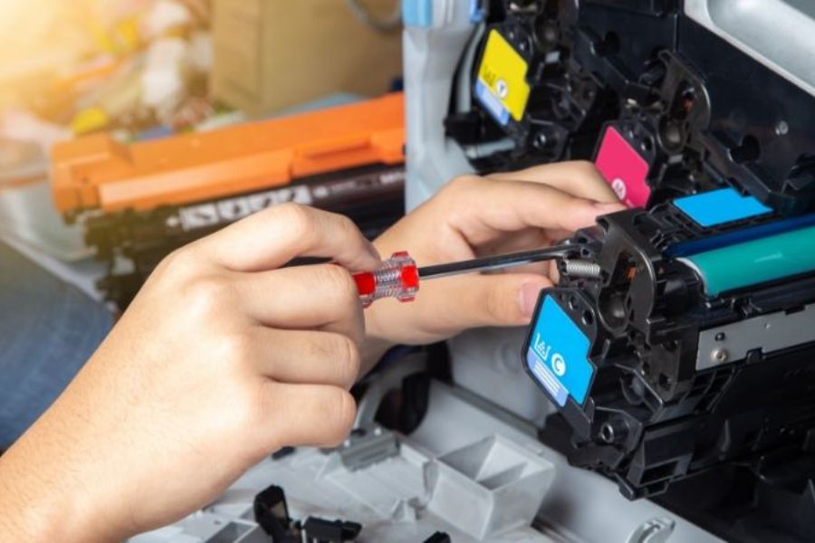 - Vệ sinh máy in thường xuyên: Điều này giúp loại bỏ bụi bẩn, xác côn trùng nhỏ,… để thiết bị hoạt động tốt nhất, tránh hỏng hóc không mong muốn.