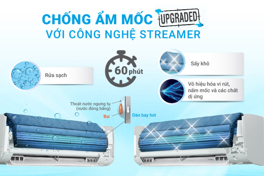 - Chức năng chống ẩm mốc tự động sẽ kích hoạt chế độ chỉ chạy quạt trong 1 giờ sau khi tắt máy để làm khô dàn lạnh. Nhờ vậy giảm tối đa sự phát sinh nấm mốc, đảm bảo hiệu quả làm lạnh và tăng tuổi thọ điều hòa.