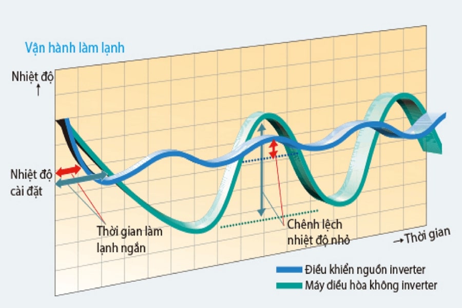 - Tiếp sau đó, máy lạnh Inverter sẽ nâng dần công suất làm lạnh để làm lạnh với công suất lớn, làm lạnh một cách tối đa để máy lạnh nhanh chóng đạt đến nhiệt độ được yêu cầu.