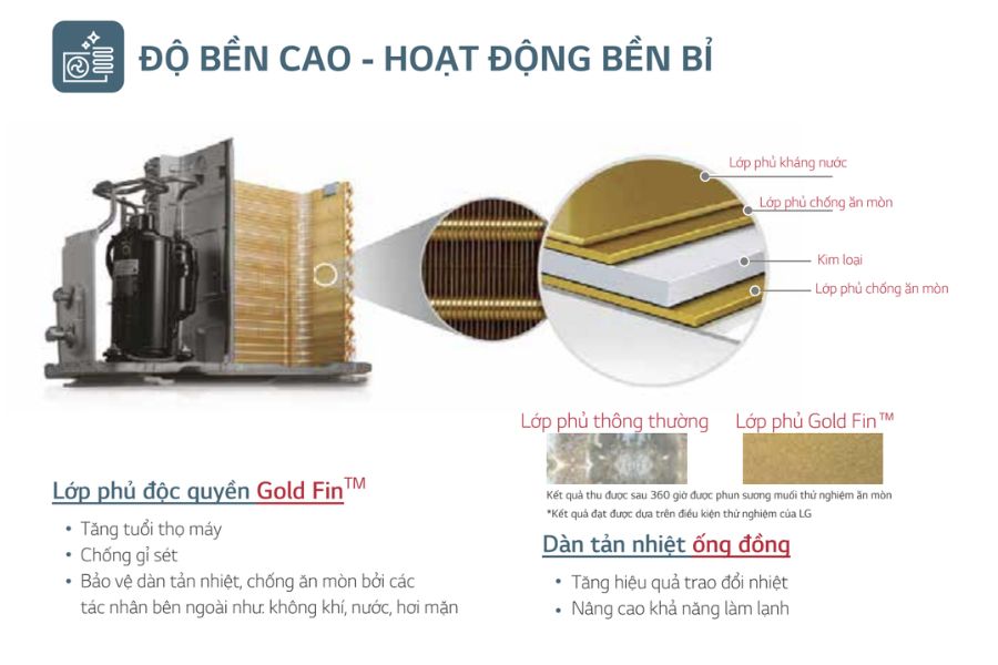 Lớp phủ Gold Fin được bảo vệ bởi một lớp chống ăn mòn, chống oxy hóa và chống axit, giúp chống lại các tác nhân gây ăn mòn như muối, khói, độ ẩm, nước mưa, v.v. Điều này giúp tăng độ bền của máy lạnh và kéo dài tuổi thọ.
