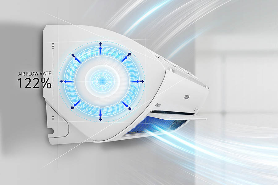 - Miệng thổi gió rộng hơn 54%: Hơi lạnh được thổi ra nhiều hơn so với máy lạnh thông thường, tạo cảm giác mát lạnh ngay tức thì.