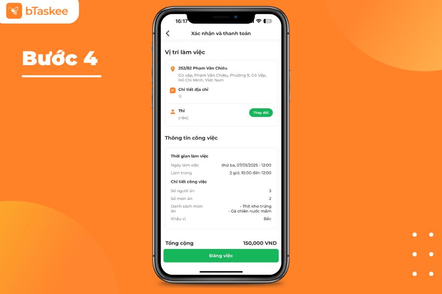 Khi đặt lịch trên app bTaskee, khách hàng sẽ cung cấp thông tin để bTaskee hiểu rõ sở thích, số lượng người ăn và các yêu cầu về nguyên liệu hoặc chế độ ăn (chay, kiêng đường, dị ứng thực phẩm).