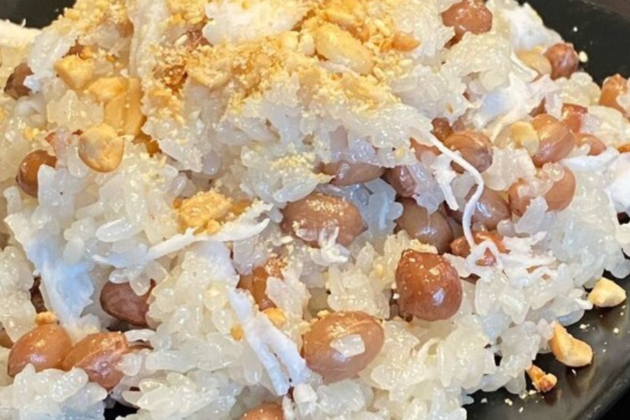 - Bước 1: Bố mẹ hãy chuẩn bị đậu phộng (lạc) luộc chín trước để tiết kiệm thời gian. Tiếp đến là ngâm nếp với nước cốt dừa và cho thêm chút muối để xôi được đậm đà.