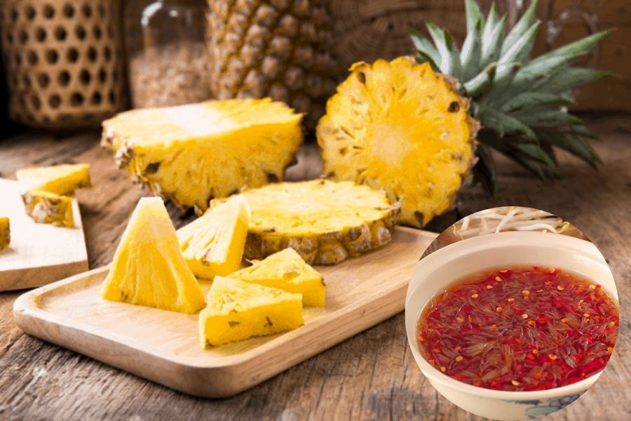 Sơ chế 1 trái dứa và cắt thành hạt lựu rồi bắc lên bếp để xào trong 3 phút. Bỏ thêm 60g muối, 120g đường và 20ml xì dầu vào xào cùng dứa. Đợi sau khi hỗn hợp sôi và chuyển màu, hãy tắt bếp và lọc bã qua rây. Bạn đã thu được thành phẩm bát nước mắm chay sánh quyện thơm ngon.