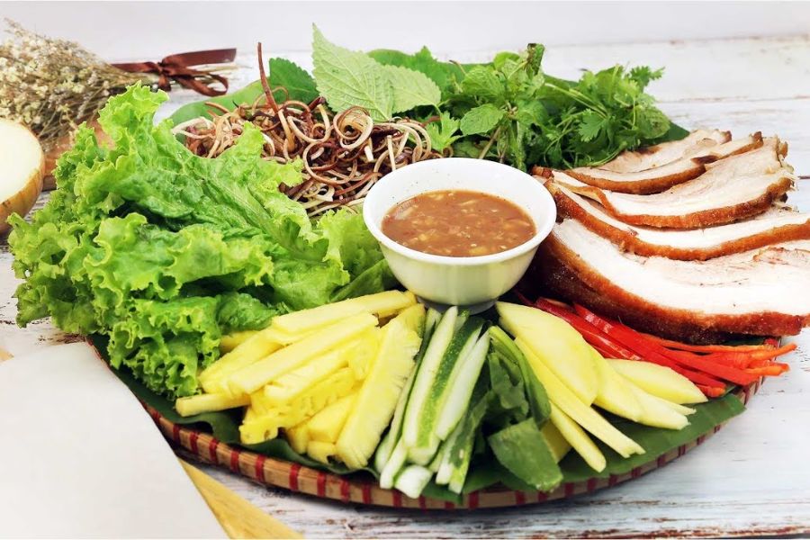 Chỉ với bánh tráng phơi sương dẻo dai, thịt heo xen kẽ hai lớp mỡ nạc béo ngậy, cùng với đó là các loại rau thơm. Một trong những thành phần không thể thiếu của món ăn đó chính là nước chấm mắm nêm có vị mặn đậm đà, ngọt ngọt cùng chút cay nồng.