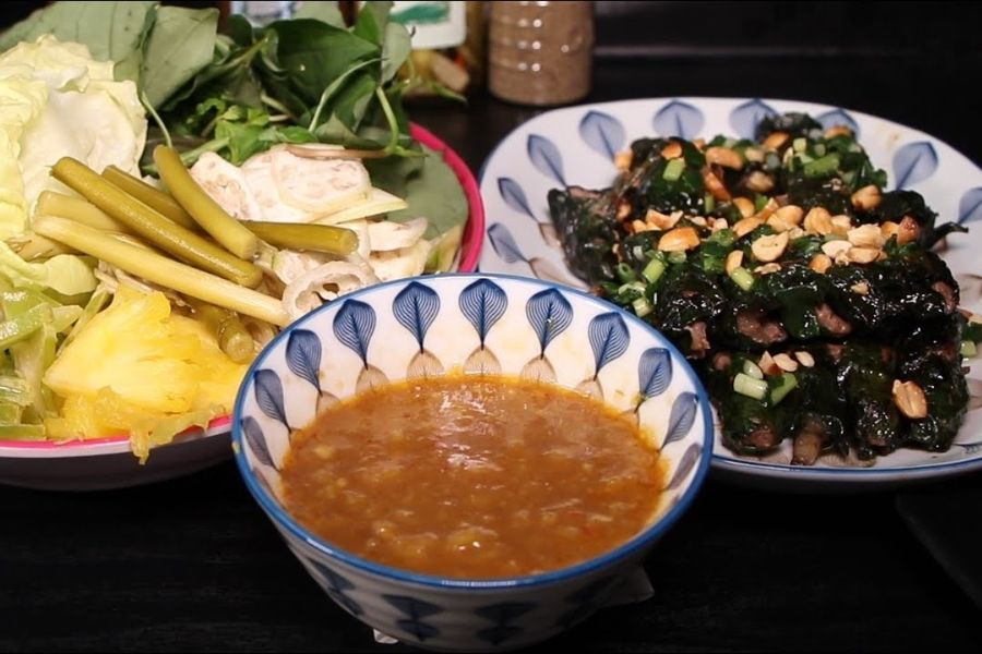 Cuốn bánh tráng với một cuốn bò lá lốt cùng các loại rau ngon, khế hoặc chuối sống chát chát, bún tươi rồi chấm vào nước chấm mắm nêm thì không còn gì phải chối từ.