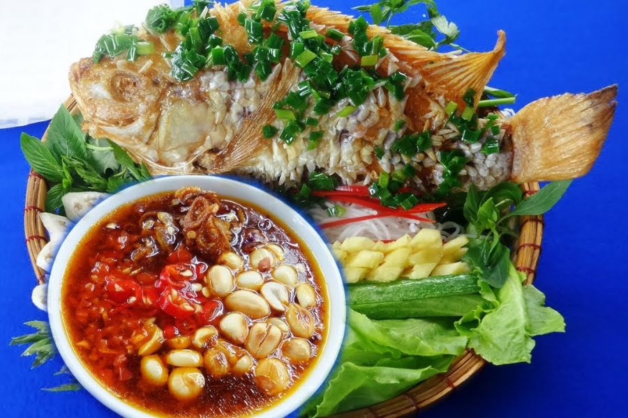 Ngoài những nguyên liệu cơ bản như món cá hấp thì cá chiên sẽ được chiên vàng giòn, chấm cùng với chén nước mắm chấm chua ngọt.