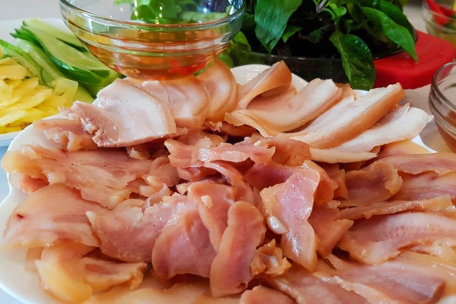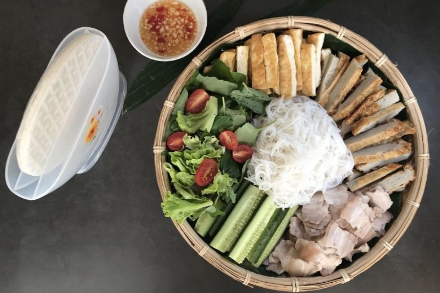 Món ăn này không chỉ xuất hiện vào những ngày Tết mà còn phù hợp ở những bữa cơm hàng ngày hay cuối tuần. Những miếng thịt ngâm mằn mặn, béo ngậy thái mỏng cuốn chung với các loại nguyên liệu như dưa leo, xà lách, rau thơm, xoài, bún tươi,… vô cùng hấp dẫn.