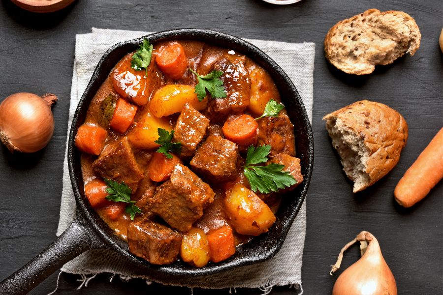 Món bò kho là sự kết hợp giữa thịt bò, khoai tây, cà rốt và các loại gia vị khác. Thường được ăn kèm với cơm hoặc bánh mì. Để làm bò kho thơm ngon, người ta thường ướp thịt bò với các gia vị trước khi nấu để thịt bò ngấm đầy đủ hương vị.