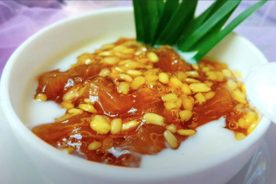 Chè bưởi là món tráng miệng rất được yêu thích, đặc biệt là trong ngày hè oi ả. Cùi bưởi được nấu giòn sần sật cùng đậu xanh thơm bùi và nước cốt dừa béo ngậy. Là món ăn vừa ngon miệng vừa giúp cơ thể giải nhiệt rất tốt.