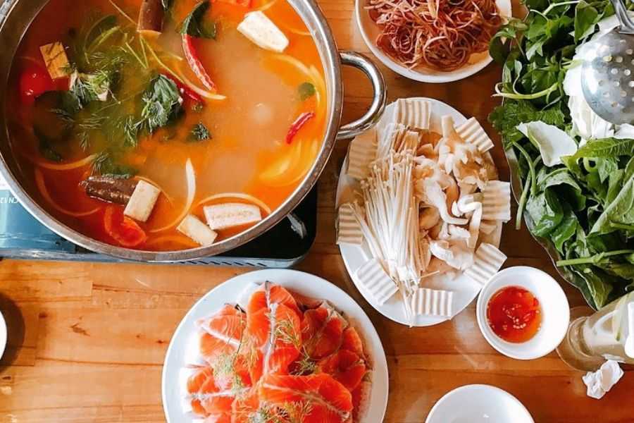 Món ăn ngon từ cá hồi đông lạnh không thể bỏ qua món lẩu cá hồi chua cay. Lẩu cá hồi chua cay luôn là một trong những món ăn phổ biến nhất trong thực đơn cho những buổi họp mặt bạn bè hay gia đình.