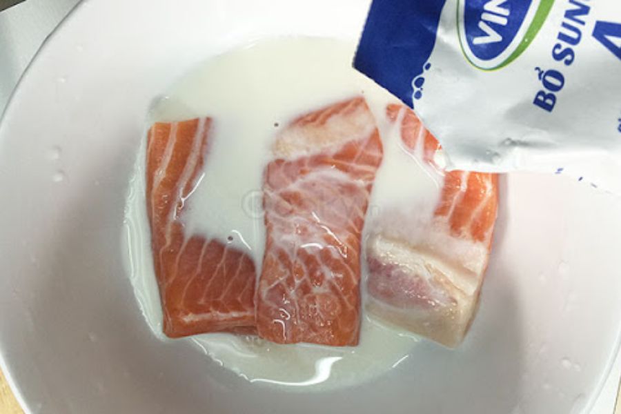 - Dùng sữa tươi: Ngâm cá hồi đã cắt lát trong sữa tươi từ 3 đến 5 phút rồi rửa sạch lại với nước, để ráo sau đó bạn có thể chế biến thành các món ăn ngon. Cách này giúp khử mùi tanh của cá hồi rất tốt.