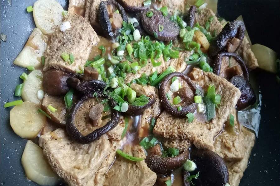 Mỗi bữa ăn đều là tâm huyết của người nội trợ, món sườn non chay kho tiêu dễ làm thơm ngon có mùi thơm nhẹ của tiêu hòa quyện với sườn chay giòn dai cực kỳ hấp dẫn. Bạn có thể cắt thêm ớt tươi để ăn kèm nhé.