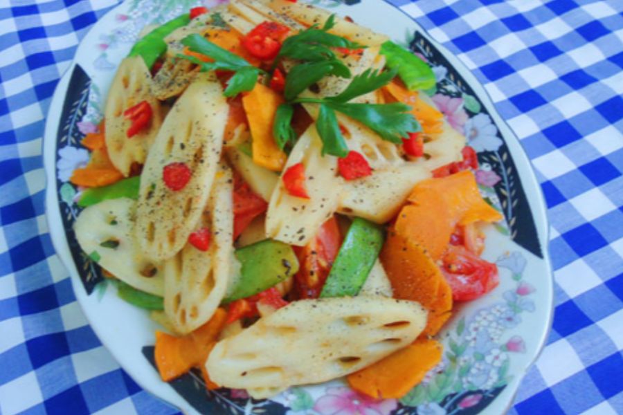 - Bước 4: Tiếp tục xào ngó sen và rau củ trong vài phút cho đến khi mọi thành phần được nấu chín và gia vị thấm đều.
