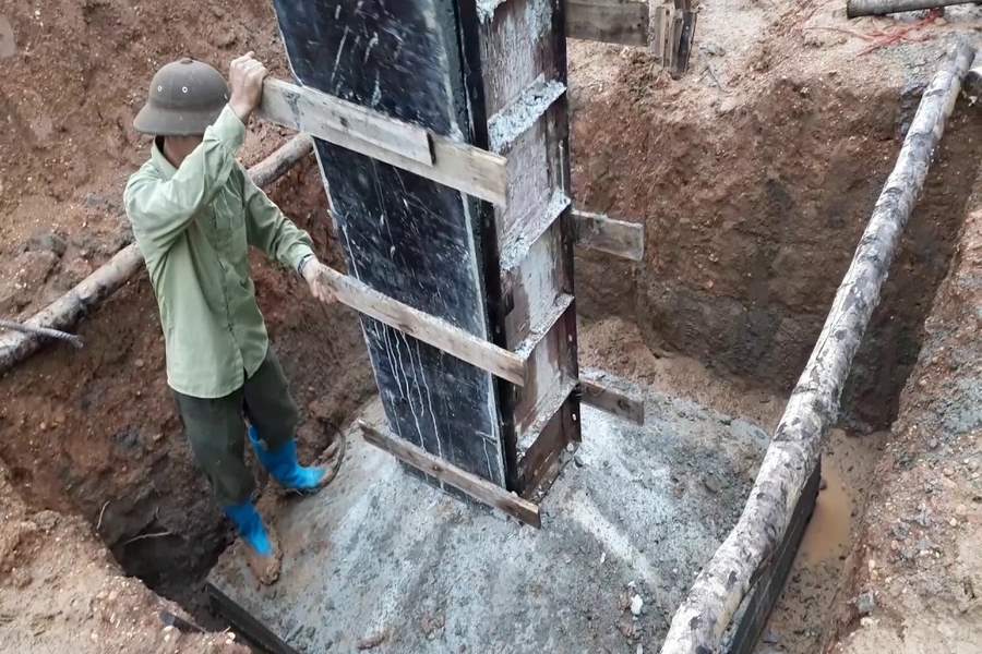 - Bước 4: Trước khi tiến hành đổ bê tông móng, bạn cần ghép cốp pha móng. Ở bước này thì các công nhân xây dựng phải lưu ý cẩn trọng và tỉ mỉ trong quá trình lắp dựng cốp pha ghép kín chặt vào nhau. Ngoài ra tim móng và cột móng sẽ cần cố định ở một vị trí thì mới tiến hành bước tiếp theo được.