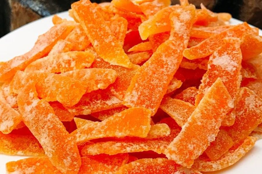 Mứt vỏ cam có hương thơm nồng, mứt dẻo, dai, vị mứt cay nồng vô cùng hấp dẫn. Không chỉ hương vị thơm ngon, mứt vỏ cam còn là một liều thuốc phòng đau họng, trị ho khá là hiệu quả.