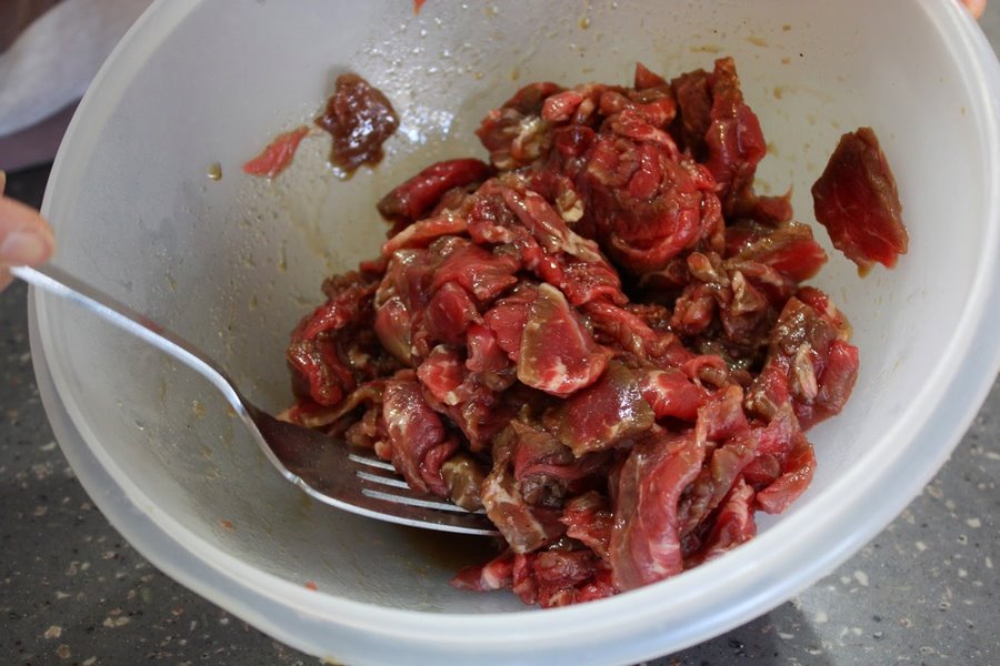 - Bước 3: Thịt sau khi ướp thì chần qua nước sôi rồi cho vào hỗn hợp sốt đã pha và đảo đều. Cuối cùng cho thêm rau thơm, rau mùi và hành tây vào trộn để tăng hương vị cho món ăn.