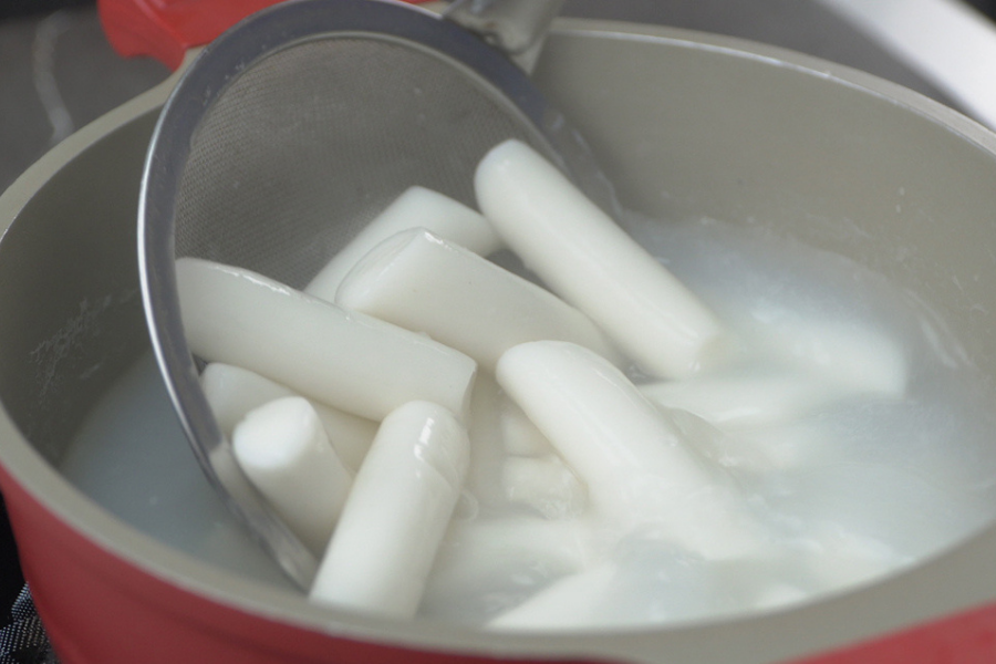 - Luộc bánh gạo trong khoảng 5-7 phút, bánh hơi nổi lên thì tắt bếp.