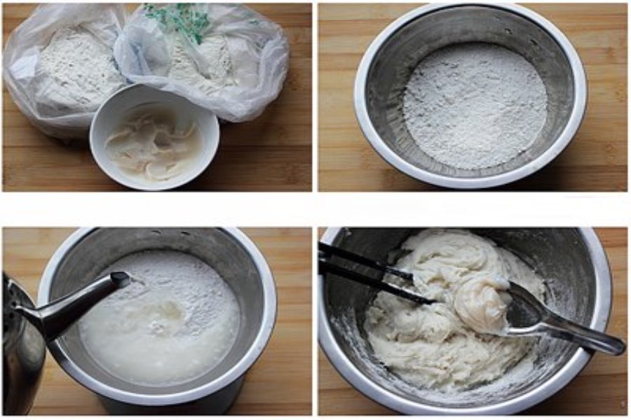- Từ từ cho nước ấm vào bột, nhào đều tay đến khi bột thành khối mịn.