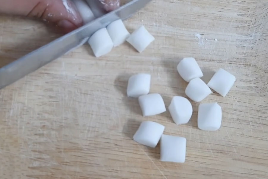 - Cắt các sợi bột dài thành các khúc nhỏ vừa ăn.