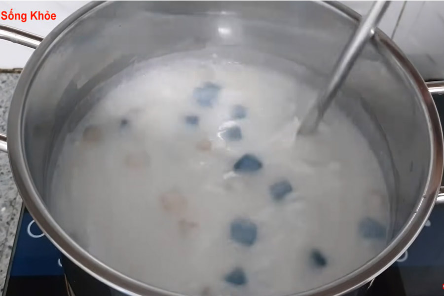 - Tiếp đến, cho phần dừa non vào nồi chè và tiếp tục đun thêm khoảng 5 phút rồi tắt bếp.