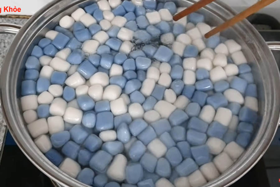 - Cho 2 lít nước vào nồi, sau đó cho phần bột lọc màu trắng vào luộc đến khi nào sôi thì bạn cho tiếp phần bột màu xanh vào luộc chung.