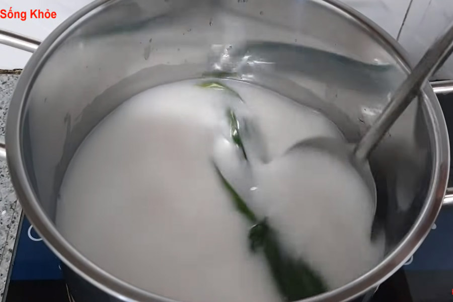 - Khi đường tan hết thì bạn vớt bỏ lá dứa sau đó cho 300ml nước cốt dừa vào nồi.