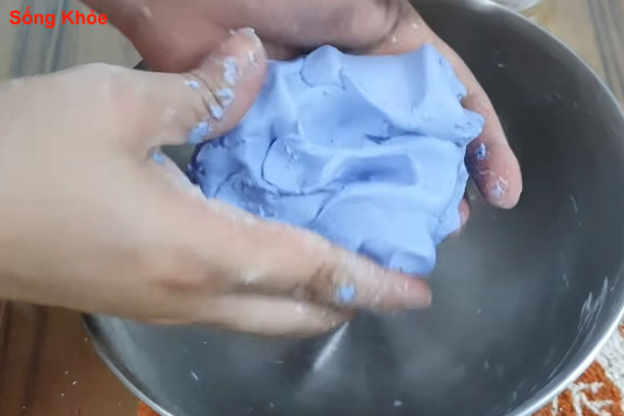 - Khi nước hoa đậu biếc sôi lên thì bạn cho nước vào trộn với phần bột 120g. Sau đó bạn nhồi bột thật mịn.
