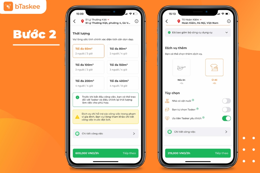 | Đội ngũ thực hiện | Chỉ có 1 Tasker. Ưu điểm: Cá nhân hóa việc dọn dẹp tùy ý, trực tiếp hướng dẫn Tasker dựa trên mong muốn của gia đình. | Nhóm từ 2-4 Tasker, có nhóm trưởng phụ trách. Ưu điểm: Tiết kiệm thời gian, đón Tết trong không gian mới mẻ, sạch sẽ. |
