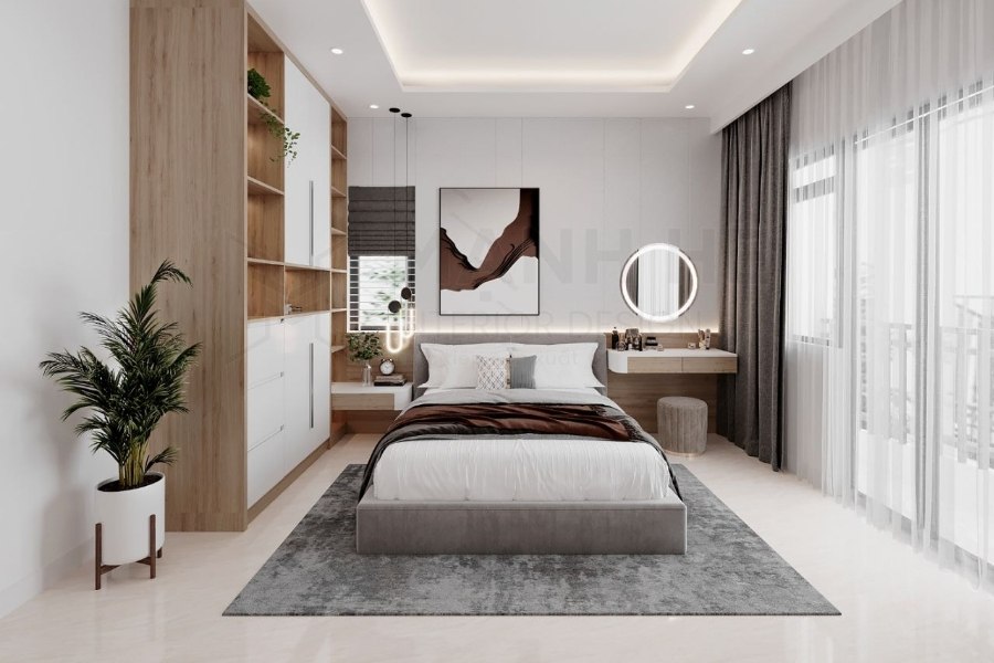 Tương tự như trên, phòng ngủ cũng cần được trang bị những thiết bị và nội thất cơ bản để phục vụ nhu cầu của người sử dụng, bao gồm: Giường, nệm, chăn màn, tủ quần áo, bàn làm việc, kệ đầu giường, bàn trang điểm,…