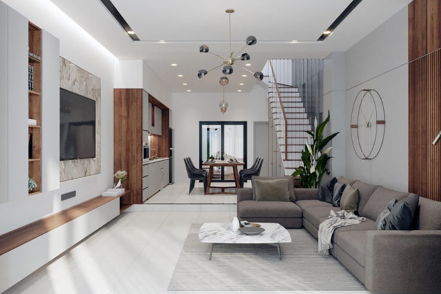 Nội thất cơ bản của phòng khách không thể thiếu bao gồm: tivi, bàn ghế uống nước, kệ tivi, kệ trang trí, vách ngăn với các khu vực khác (đối với không gian mở),…