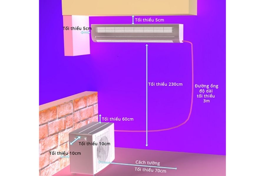 Bạn nên chọn vị trí đặt máy thích hợp, sao cho cách trần nhà tối thiểu 5cm. Máy đặt cách sàn tối thiểu 2,3m. Chọn sao cho ống đồng ngắn nhất và vị trí đặt dàn nóng thích hợp.