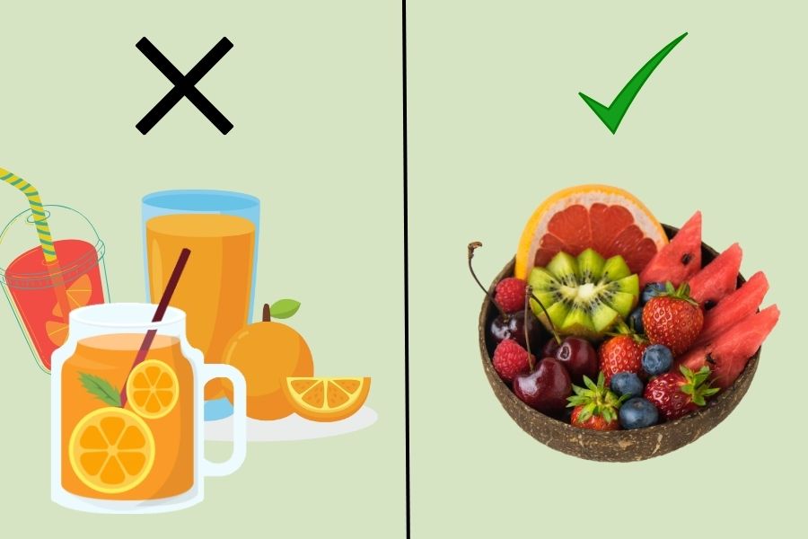 Trong trái cây chứa một lượng lớn chất xơ, chất xơ này rất tốt cho quá trình tiêu hóa của cơ thể. Tuy nhiên, khi trái cây, rau củ ép lấy nước thì sẽ được lược bỏ hoàn toàn phần xác nên sẽ không còn chất xơ. Vậy nên, bạn nên ăn trực tiếp hoặc xay rau củ, trái cây để dùng thay vì uống nước ép để có thể hấp thu được tối đa lượng chất dinh dưỡng.