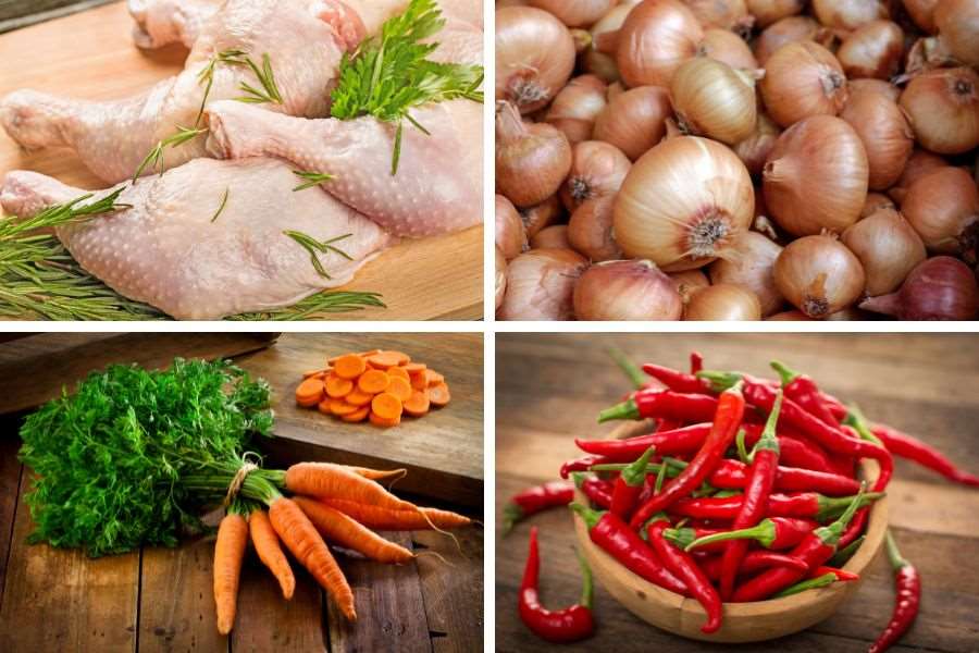 - Hẹ, cà rốt, hành tây rửa sạch, cắt thành những miếng vừa ăn.