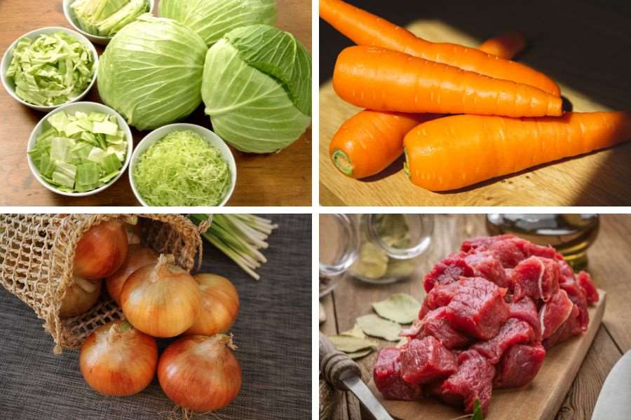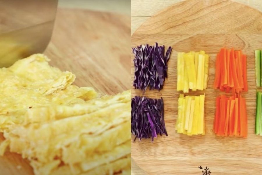 - Bước 1: Sơ chế nguyên liệu: Bắp cải, cà rốt, hành tây gọt vỏ, rửa sạch, cắt sợi nhỏ. Thịt bò rửa sạch, thái lát mỏng, ướp với 1 muỗng cà phê nước mắm, 1/2 muỗng cà phê bột ngọt, 1/2 muỗng cà phê tiêu xay, để khoảng 15 phút cho thấm gia vị.
