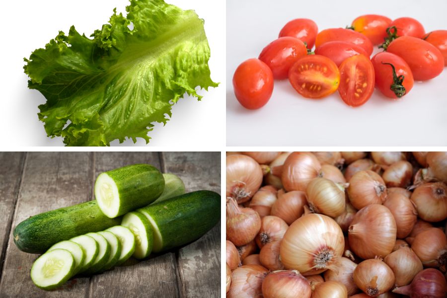 - Bước 1: Sơ chế nguyên liệu: Rửa sạch tất cả các nguyên liệu như xà lách, dưa leo, cà chua, hành tây. Sau đó xà lách cắt thành những miếng vừa ăn, cà chua bi cắt đôi, dưa leo cắt hoặc bào sợi nhỏ. Hành tây cắt lát mỏng rồi ngâm vào nước đá lạnh để khử mùi hăng.